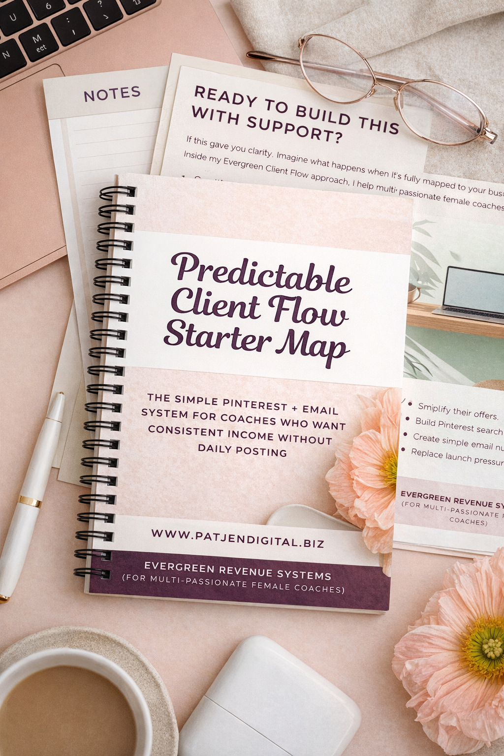 Inside the Predictable Client Flow Starter Map, I walk you through the simple framework I use to help coaches move from inconsistent visibility to steady client flow using Pinterest and email.